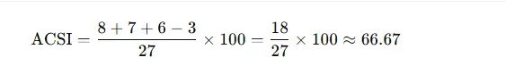 Uma pontuação ACSI de ≈66,67 indica um nível moderado de satisfação do cliente, considerando a experiência, expectativas e contexto competitivo.
